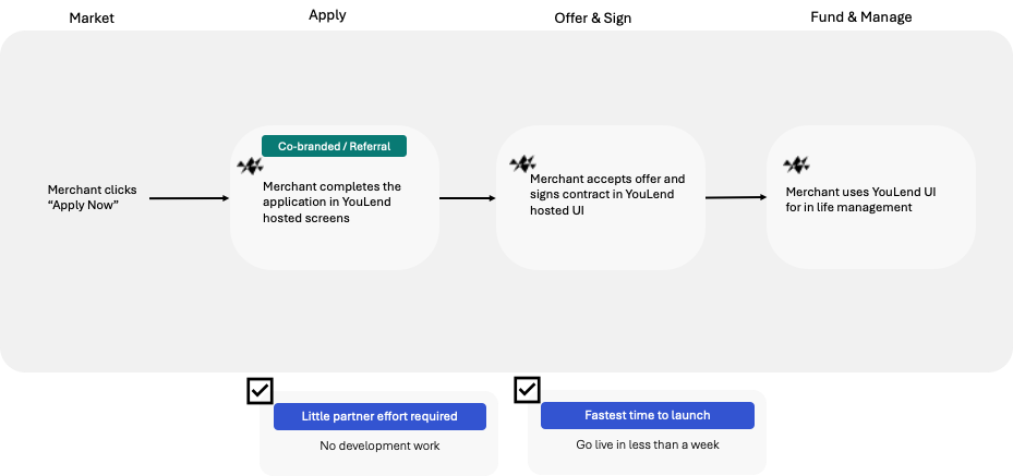 YouLend's 1 Click Referral (pre-filled onboarding) journey is easy for partners to start with, as there is only one API endpoint to integrate.